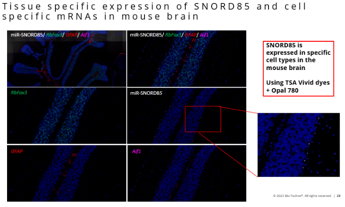 在小(xiǎo)鼠腦組織切片的檢測中(zhōng),也可(kě)獲得理(lǐ)想的結果。SNORD85可(kě)在小(xiǎo)鼠腦某些細胞中(zhōng)特異性表達,下圖中(zhōng)除了對SNORD85進行檢測外,也對小(xiǎo)鼠的神經元(Rbfox3)、星形膠質(zhì)細胞(GFAP)、小(xiǎo)膠質(zhì)細胞(Aif1)同時進行檢測,可(kě)見不同靶标特異的定位特征。