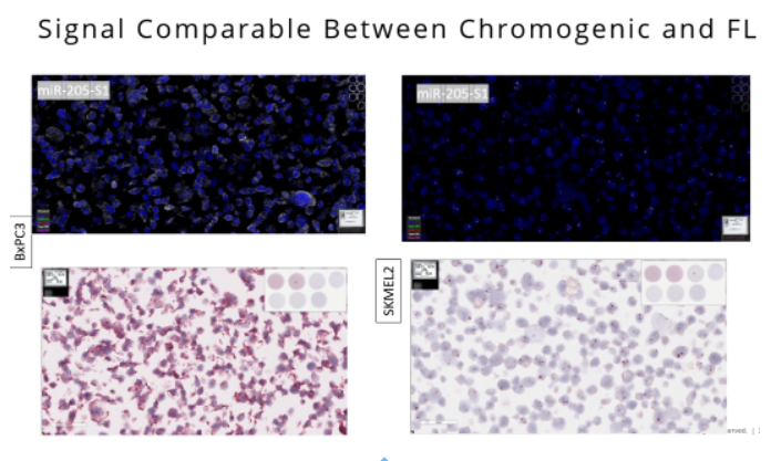 針對同一個miR-205分(fēn)子,對比使用(yòng)RNAscope Plus的熒光信号與使用(yòng)可(kě)見光試劑盒miRNAscope的可(kě)見光紅染信号,二者對于miR-205不同表達豐度的細胞中(zhōng)小(xiǎo)RNA分(fēn)子的檢出結果有(yǒu)較高的一緻性,證明不同的顯色方式對于靶标的檢測沒有(yǒu)影響。